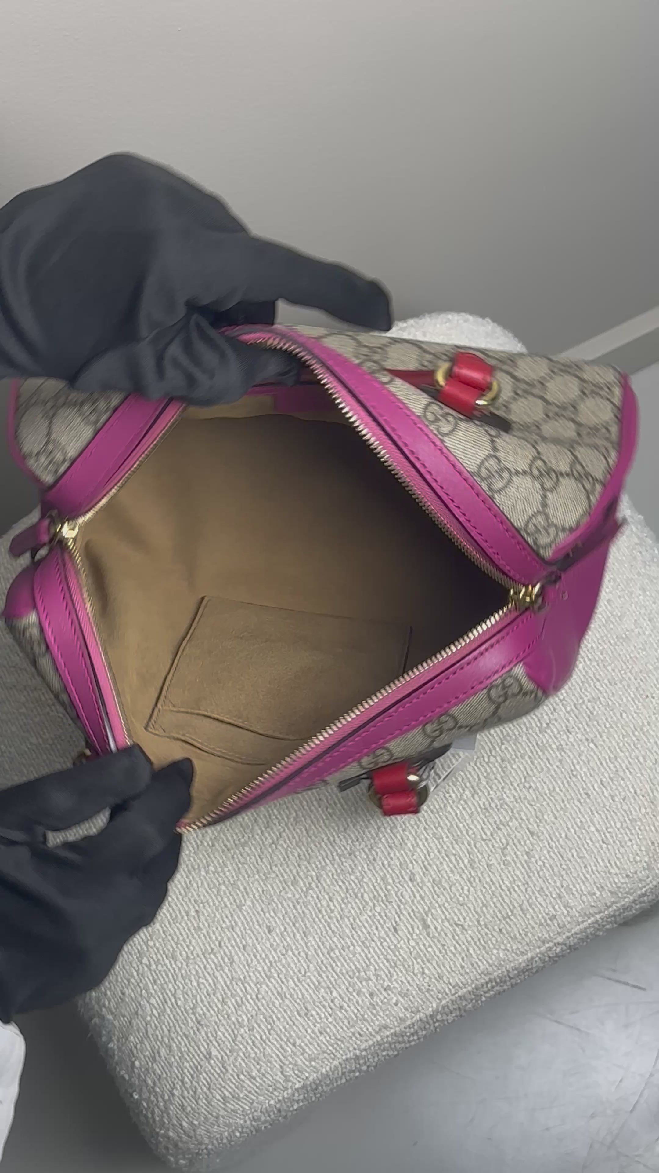 GUCCI SMALL GG SUPREME SATCHEL BAG IN BROWN